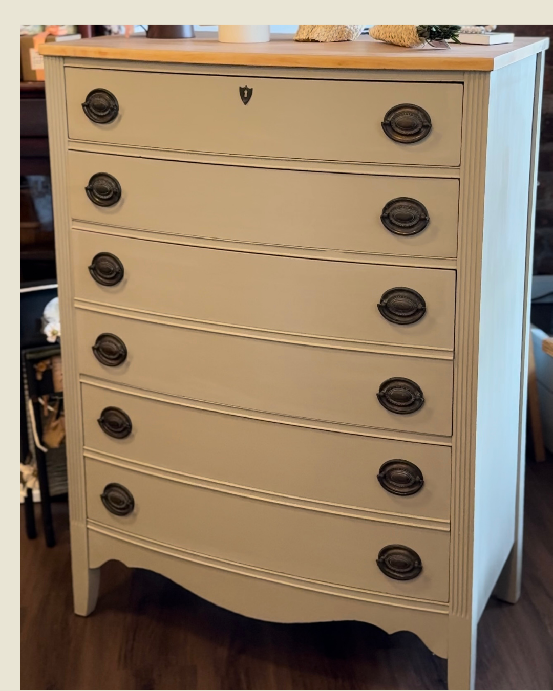 Olive Chest – A timeworn green chest with original brass pulls and old-world character in every drawer.